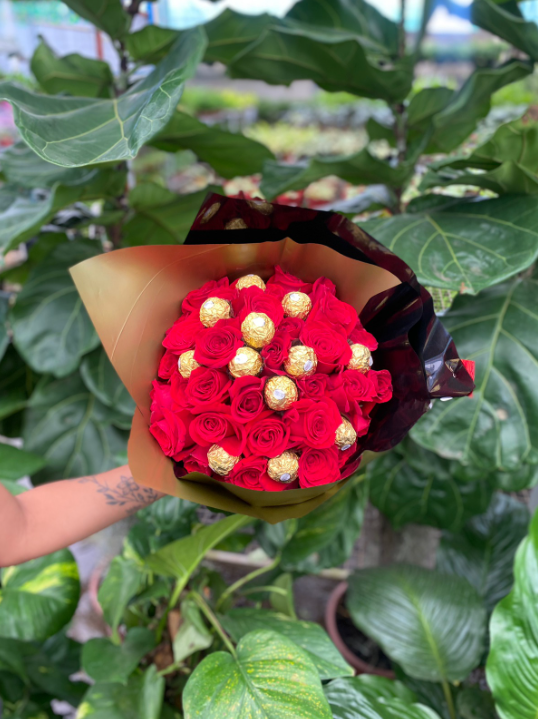 Buquê com 40 botões de rosas nacionais e 12 chocolate ferrero Rocher, com acabamento em laço e poli!