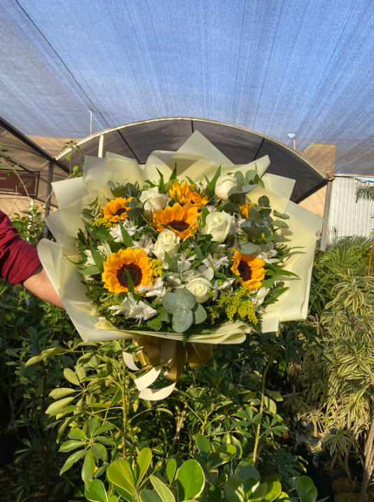 Este elegante buquê de rosas e girassol é uma verdadeira obra de arte floral, combinando a beleza exuberante das flores. Cada flor, cuidadosamente selecionada, exala sofisticação e frescor. Perfeito para momentos especiais, este buquê é uma celebração da natureza e da arte de encantar.