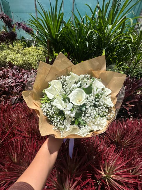 Composto por Copos-de-leite selecionados e Gipsófila (mosquitinho), este buquê une o design escultural das flores brancas ao acabamento rústico do papel kraft. É um arranjo minimalista, elegante e atemporal.