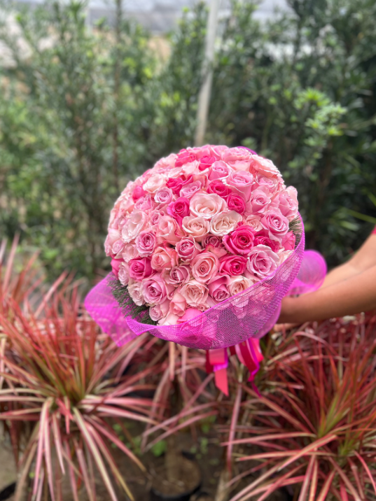 Buquê com 100 rosas nacionais, folhagem vassourinha, com acabamento em tela e laço!