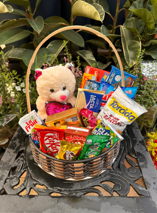 1 arranjo ou pelúcia, 1 barra de chocolate, 1 Toddynho, 1 Club Social, 1 bis, 1 batata Ruffles, 1 bolinho Bauducco, 1 KitKat, 1 biscoito wafer, 2 bombons, 1 Ferrero Rocher T-4, 1 amendoim, 1 caixa de chocolate, 1 petisco, 1 Suco