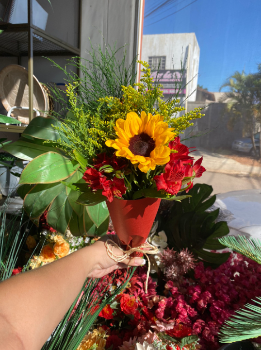 Um arranjo lindo, simples de um girassol e folhagens que dão um acabamento sofisticado.
